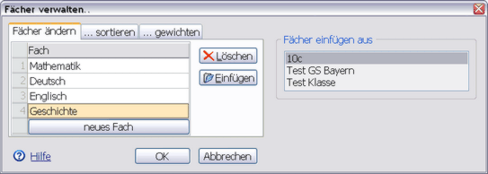 Wollen Sie ein bestehendes Fach löschen, so markieren Sie das betreffende Fach und klicken anschließend auf die Schaltfläche "Löschen".