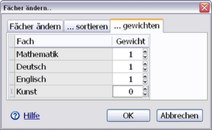 Als Voreinstellung wird jedes Fach mit dem Faktor 1 gewichtet.
