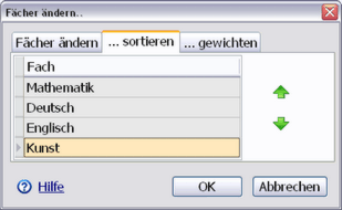 Sie können jederzeit die angezeigte Reihenfolge beispielsweise in den aufklappbaren Listen der Symbolleiste ändern. Wählen Sie hierzu im Fenster "Fächer ändern" die Registerkarte ".. sortieren". Markieren Sie anschließend in der Liste ein Fach und benutzen Sie die grünen Pfeiltasten, um dieses Fach in der Reihenfolge nach oben oder unten zu bewegen. Praxistipp: Stellen Sie häufig benötigte Fächer an den Anfang der Liste, um schnell darauf zugreifen zu können. |