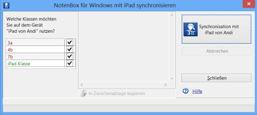 Setzen Sie im folgenden Dialogfenster bei jeder Klasse, die Sie mit Ihrem iPad / iPhone synchronisieren möchten, einen Haken und starten Sie anschließend den Synchronisierungs-Vorgang über die Schaltfläche "Synchronisation..".