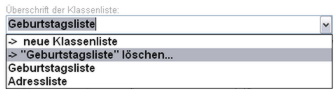 Benötigen Sie für Ihre Arbeit eine bestimmte Klassenliste nicht mehr, so können Sie diese jederzeit löschen. Wählen Sie dazu aus der aufklappbaren Liste die entsprechende Option, z. B. "->Geburtstagsliste löschen...".