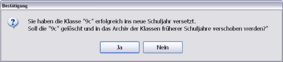 Zum Abschluss des Versetzungsvorgangs bestimmen Sie, was mit der alten Klasse geschehen soll. Bestätigen Sie den Dialog mit "Ja", um die alte Klasse zu löschen und in das Archiv der früheren Schuljahre zu verschieben. Wählen Sie "Nein", wenn Sie weiterhin mit der alten Klasse arbeiten möchten. Die Option "Nein" kann beispielsweise dann sinnvoll sein, wenn Sie vor Abschluss eines Schuljahres bereits Ihre neuen Klassen für das folgende Schuljahr anlegen möchten.