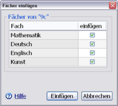 Als Nächstes wählen Sie die Fächer aus, die Sie auch in der neuen Klasse unterrichten. Neue Fächer sowie die zugehörigen Notenbereiche legen Sie ggf. in den folgenden Dialogfenstern (siehe auch Neue Klasse anlegen) an. |