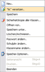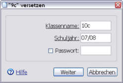 Unterrichten Sie eine Klasse über mehrere Schuljahre hinweg, so ist es zu Beginn eines neuen Schuljahres nicht nötig, die Klasse erneut anzulegen. Die NotenBox bietet Ihnen die Möglichkeit, die betreffende Klasse zu versetzen. Rufen Sie dazu im Menü "Klasse" die Option "Klasse versetzen..." auf.