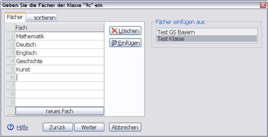Haben Sie zuvor bereits eine andere Klasse angelegt, so besteht die Möglichkeit, einzelne oder auch alle Fächer der bereits angelegten Klasse zu übernehmen.
