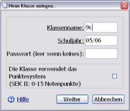 Geben Sie im entsprechenden Dialogfenster zunächst den Klassennamen und das aktuelle Schuljahr ein. Durch Eingabe eines Passwortes können Sie die Daten Ihrer Klasse vor unberechtigtem Zugriff schützen.