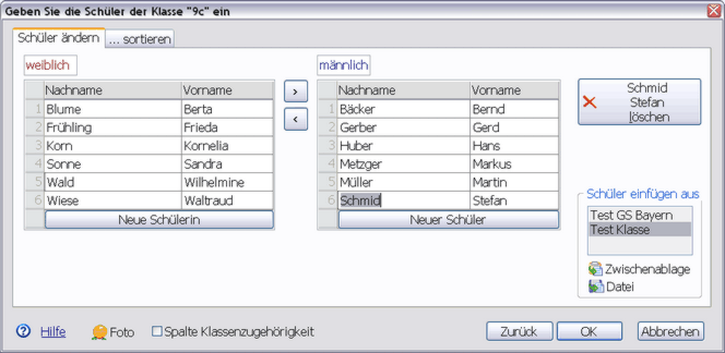 Haben Sie die Schülernamen eingegeben, so können Sie über die Registerkarte "...sortieren" die Sortierreihenfolge den eigenen Bedürfnissen entsprechend anpassen, z. B. eine alphabetische Reihenfolge oder nach Geschlechtern (bzw. den von Ihnen vergebenen Bezeichnungen) getrennt.