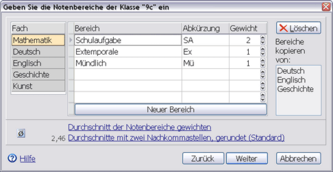 Im folgenden Dialogfenster geben Sie die Notenbereiche für die jeweiligen Fächer sowie deren Gewichtung ein. Sie können hier bis zu 12 verschiedene Notenbereiche mit jeweils unterschiedlicher Gewichtung eintragen. Einmal eingegebene Notenbereiche für ein Fach können Sie auch für andere Fächer kopieren.