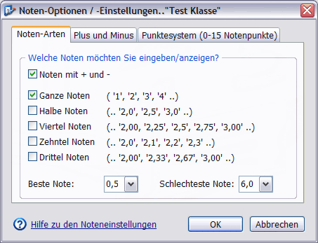 Legen Sie in der Registerkarte "Noten-Arten" fest, welche Arten von Noten Sie eingeben bzw. anzeigen lassen möchten. Wählen Sie die Option "Noten mit + und -", wenn Sie Notentendenzen durch die entsprechenden Zeichen zum Ausdruck bringen möchten. Ob die NotenBox solche Tendenzen bei der Durchschnittsberechnung berücksichtigen soll oder nicht legen Sie in einer weiteren Registerkarte Plus und Minus fest.