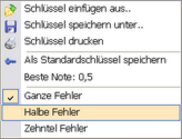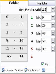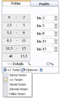 Verwenden von halben, ganzen und Zehntelfehlern Über die Schaltfläche "Optionen" können Sie festlegen, ob Sie nur ganze Fehler, halbe Fehler oder auch Zehntelfehler bei der Festlegung der Grenzwerte verwenden möchten. Je nach gewählter Option ändert sich auch die Darstellung der Übersicht des Notenschlüssels. |