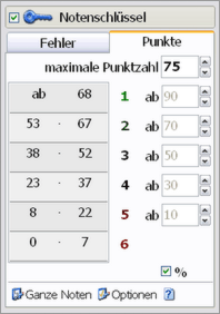 Sie können Noten einer Arbeit nicht nur direkt eingeben, sondern die NotenBox bietet Ihnen auch die Möglichkeit, einen frei definierbaren Punkte- bzw. Fehlerschlüssel zur Noteneingabe zu verwenden. Wählen Sie hierzu die Schaltfläche "Notenschlüssel" im Fenster zur Eingabe von Noten. |