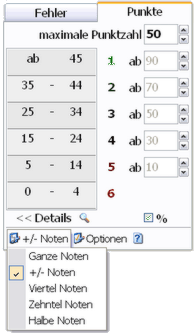 Art der Noten Über das entsprechende Auswahlfeld können Sie zusätzlich festlegen, ob Sie lediglich ganze Noten, +/- Noten, Viertel-, Zehntel- oder Halbe-Noten verwenden möchten. Je nach gewählter Option rechnet die NotenBox die von Ihnen eingegebene Punktzahl in die entsprechende Note um.