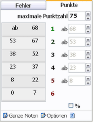 Verwenden von halben, ganzen und Zehntelpunkten Über die Schaltfläche "Optionen" können Sie festlegen, ob Sie nur ganze Punkte, halbe Punkte oder auch Zehntelpunkte bei der Festlegung der Grenzwerte verwenden möchten. Je nach gewählter Option ändert sich auch die Darstellung der Übersicht des Notenschlüssels. |