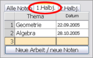 Selbstverständlich können Sie auch nach dem Umschalten der NotenBox auf das zweite Halbjahr noch Noten für das erste Halbjahr eintragen. Wechseln Sie hierzu bei der Noteneingabe in die Registerkarte "1. Halbj." und legen Sie wie gewohnt eine neue Arbeit an. Die NotenBox fragt zur Sicherheit nach, ob Sie wirklich noch Noten für das erste Halbjahr eingeben möchten, obwohl bereits Zeugnisnoten festgelegt wurden. Bestätigen Sie diesen Dialog mit "Ja" und tragen Sie nun wie gewohnt die Noten der Schüler ein. |