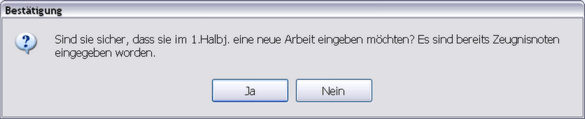 Die NotenBox wiederholt die obige Frage auch später nochmals, sobald Sie eine Zeugnisnote 1.Halbjahr löschen, mit der Eingabe-Taste bestätigen und nochmals neu eingeben.