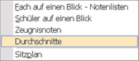 Verwenden Sie die Schaltfläche "Listen" aus der Symbolleiste und wählen Sie anschließend die gewünschte Liste. Folgende Listen stehen Ihnen zur Verfügung: Fach auf einen Blick - Notenlisten Mit dieser Liste können Sie sich schnell einen Überblick über alle Noten eines bestimmten Faches verschaffen. |