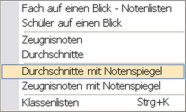Durchschnitte Diese Liste zeigt die von der NotenBox nach Ihren Vorgaben berechneten Durchschnittsnoten aller Fächer für alle Schüler einer Klasse sowie Gesamtdurchschnittsnoten. |