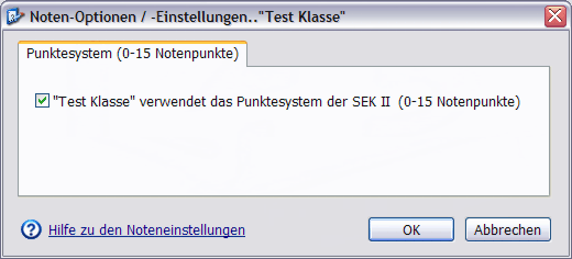Wählen Sie diese Option, wenn Sie für die aktuell ausgewählte Klasse das Punktesystem verwenden möchten. Hinweis: Verwendet eine Klasse das Punktesystem, so werden zwar "Notenpunkte" eingegeben, die NotenBox bleibt aber beim Begriff "Noten". |