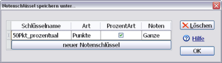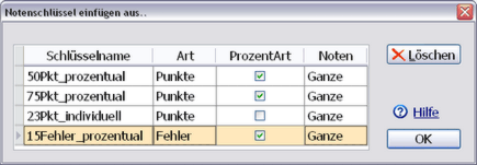 Im folgenden Fenster wählen Sie aus der Liste der gespeicherten Schlüssel den gewünschten Notenschlüssel aus und bestätigen Sie anschließend mit der Schaltfläche "OK". Die NotenBox lädt den gespeicherten Punkte- oder Fehlerschlüssel und Sie können sofort mit der Eingabe ihrer Noten beginnen.