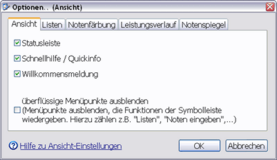 Über das Menü "Ansicht" und hier den Eintrag "Optionen" haben Sie die Möglichkeit weitere Einstellungen und Anpassungen der NotenBox vorzunehmen.
