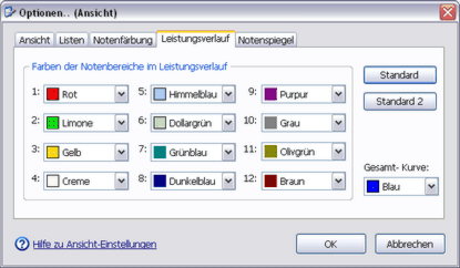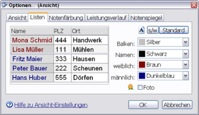 In diesem Dialogfenster können Sie Einstellungen für die Farben in den verschiedenen Notenlisten vornehmen.