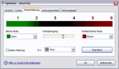 In diesem Dialogfenster können Sie Einstellungen für den Farbübergang von der besten zur schlechtesten Note vornehmen. Wählen Sie dazu jeweils eine Farbe für die beste und eine Farbe für die schlechteste Note aus und benutzen Sie den Schieberegler für den Farbübergang um das Erscheinungsbild an Ihre Bedürfnisse anzupassen.