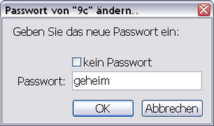 Wenn Sie das Passwort für den Zugriff auf eine bestimmte Klasse ändern möchten, so wählen Sie zunächst die betreffende Klasse über das Auswahlfeld der Symbolleiste aus und rufen anschließend den Menüpunkt "Klasse" > "Passwort ändern.." auf. Im erscheinenden Dialogfenster können Sie nun ein neues Passwort vergeben. Lassen Sie das Eingabefeld leer, um kein Passwort zu verwenden bzw. um ein bestehendes Passwort zu löschen. |