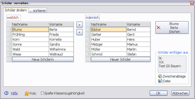 Aktivieren Sie die Option "Spalte Klassenzugehörigkeit", um eine zusätzliche Spalte in der Liste der Schüler einzublenden, in der Sie unterschiedliche Klassenzugehörigkeiten der Schüler eintragen können. Verwenden Sie diese Funktion beispielsweise für Sport- oder Religionsklassen, bei denen die Schüler aus mehreren Klassen stammen.