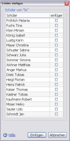 Im folgenden Dialogfenster wählen Sie nun die Schülernamen aus, die Sie in die Klasse übernehmen möchten. Bestätigen Sie anschließend durch einen Klick auf die Schaltfläche "Einfügen". Wichtiger Hinweis: Bei der Übernahme von Schülern aus bereits bestehenden Klassen werden die Schülernamen sowie gegebenenfalls weitere hinterlegte Schülerdaten übernommen, nicht jedoch bereits eingegebene Noten.