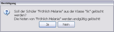 ACHTUNG: Beim Löschen eines Schülers werden auch alle bereits eingegebenen Noten endgültig gelöscht. Bestätigen Sie die Sicherheitsabfrage nur dann mit "Ja", wenn Sie sich sicher sind, dass Sie die Noten des betreffenden Schülers wirklich nicht mehr benötigen. |