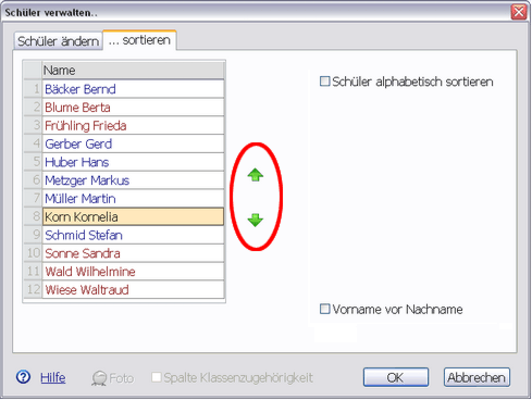 Alternativ können Sie die Liste der Schüler auch per Drag and Drop umsortieren. Klicken Sie dazu einen Schüler an und ziehen Sie ihn mit gedrückter linker Maustaste an die gewünschte Position. |